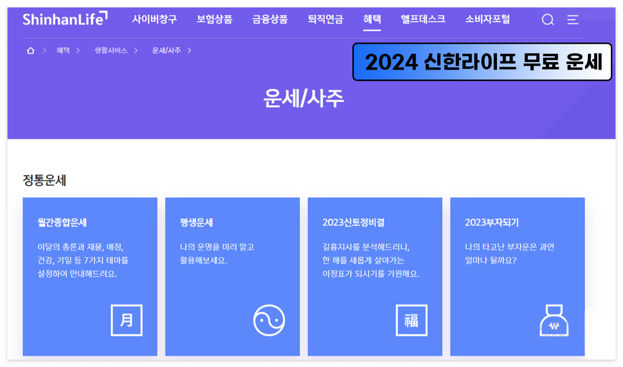 신한생명 - 혜택 - 생활서비스 - 운세/사주 순서로 들어가주시면 되겠습니다.